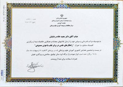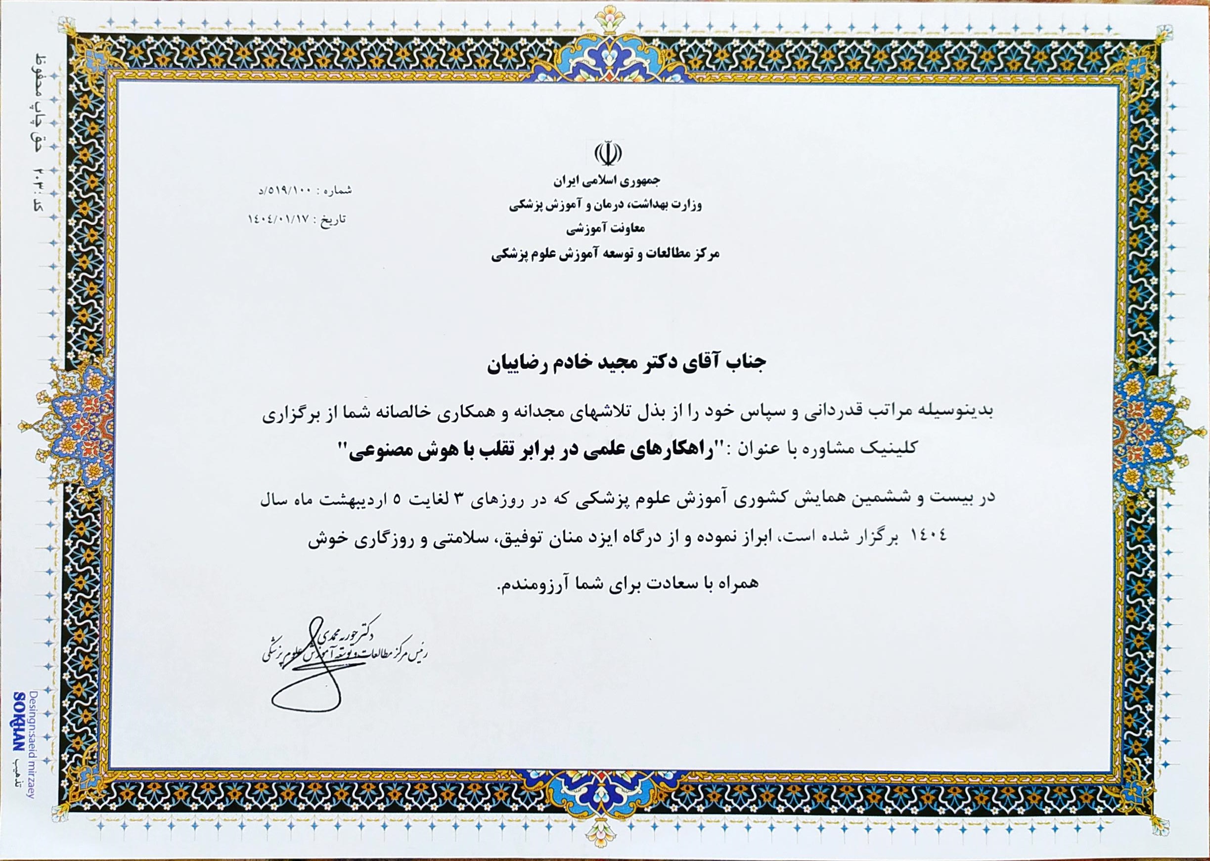 برگزاری کلینیک مشاوربا عنوان" راهکارهای علمی در برابر تقلب با هوش مصنوعی" که پیشنهادی از طرف EDC و هسته تحقیقات آموزش علوم پزشکی مشهد بوده و در بیست وششمین همایش کشوری آموزش پزشکی مورد قبول واقع شد.