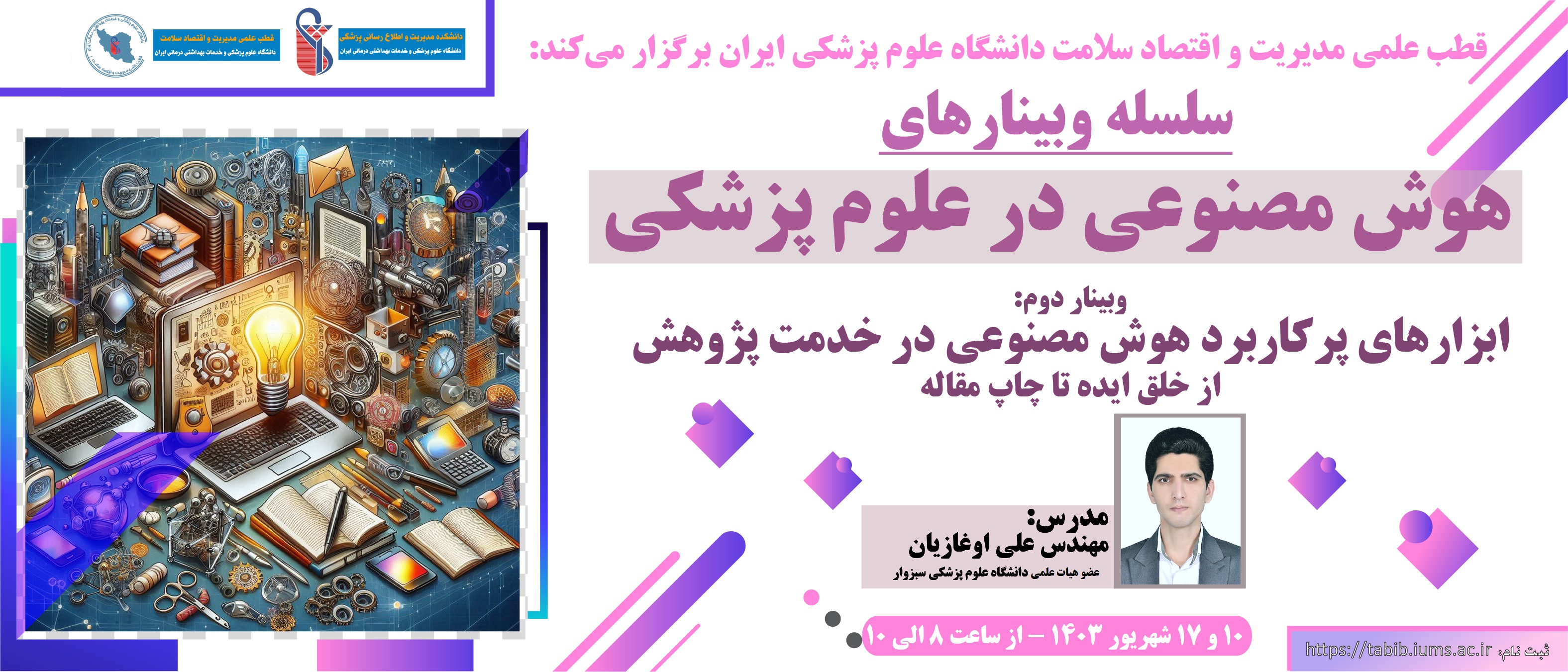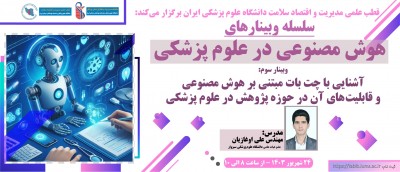 قطب علمی مدیریت و اقتصاد سلامت دانشگاه علوم پزشکی در نظر دارد یک سلسله رویداد وبینار های آموزشی با موضوع هوش مصنوعی در علوم پزشکی در تاریخ های 3،10،17،24 شهریور ماه برگزار نماید.