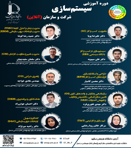 گروه پژوهشي تفكر سيستمي در دانشگاه فردوسي مشهد اقدام به طراحي و برگزاري دوره سيستم سازي شركت و سازمان نموده است ثبت نام زودهنگام دومين دوره آن آغاز شده است و تا 10 آبان ماه مهلت دارد. مشخصات دوره به شرح زير ميباشد.