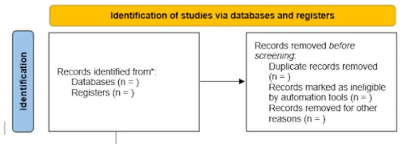 1) شناسایی : نمودار جریان با تعداد اولیه سوابق شناسایی شده از طریق منابع مختلف مانند پایگاه داده های ادبیات، جستجوهای دستی یا ابزارهای دیگر شروع می شود.