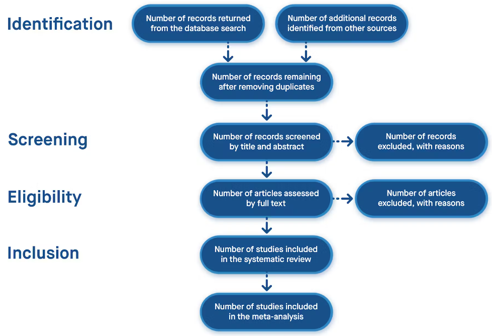 نمودار جریان معمولاً با تعداد اولیه مطالعات شناسایی شده از طریق جستجو در پایگاه داده شروع می شود. سپس تعداد مطالعات باقی مانده پس از حذف موارد تکراری و تعداد مطالعات حذف شده در هر مرحله بر اساس معیارهای واجد شرایط بودن از پیش تعریف شده را مشخص می کند. در نهایت، تعداد مطالعاتی که در تحلیل نهایی گنجانده شده است را نشان می دهد.